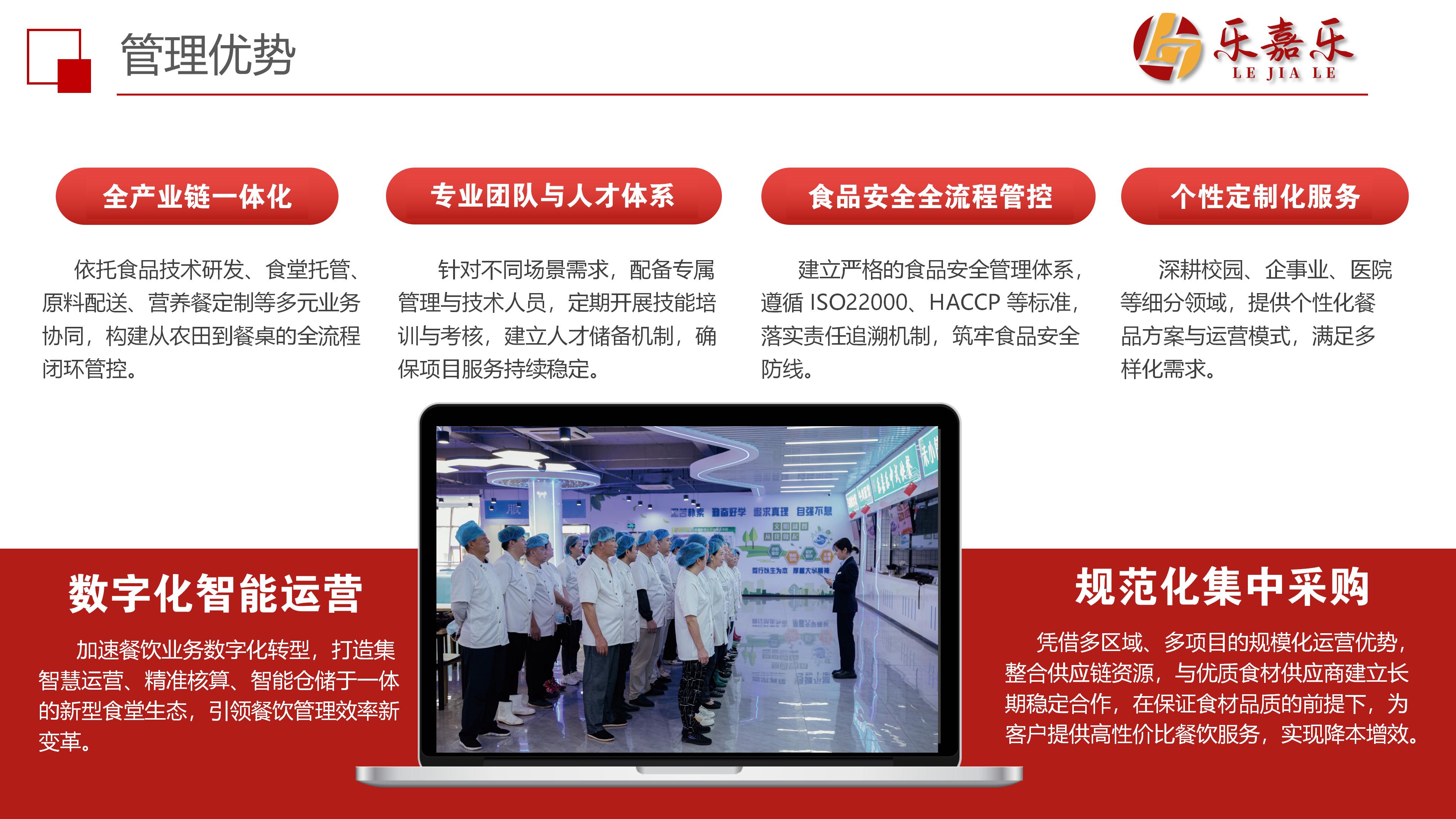 乐嘉乐餐饮以 “特色、美味、养生” 的饮食文化为核心,立足全国市场,致力于推动餐饮业向现代数智化方向发展,为保障餐饮团膳行业的健康发展贡献力量。